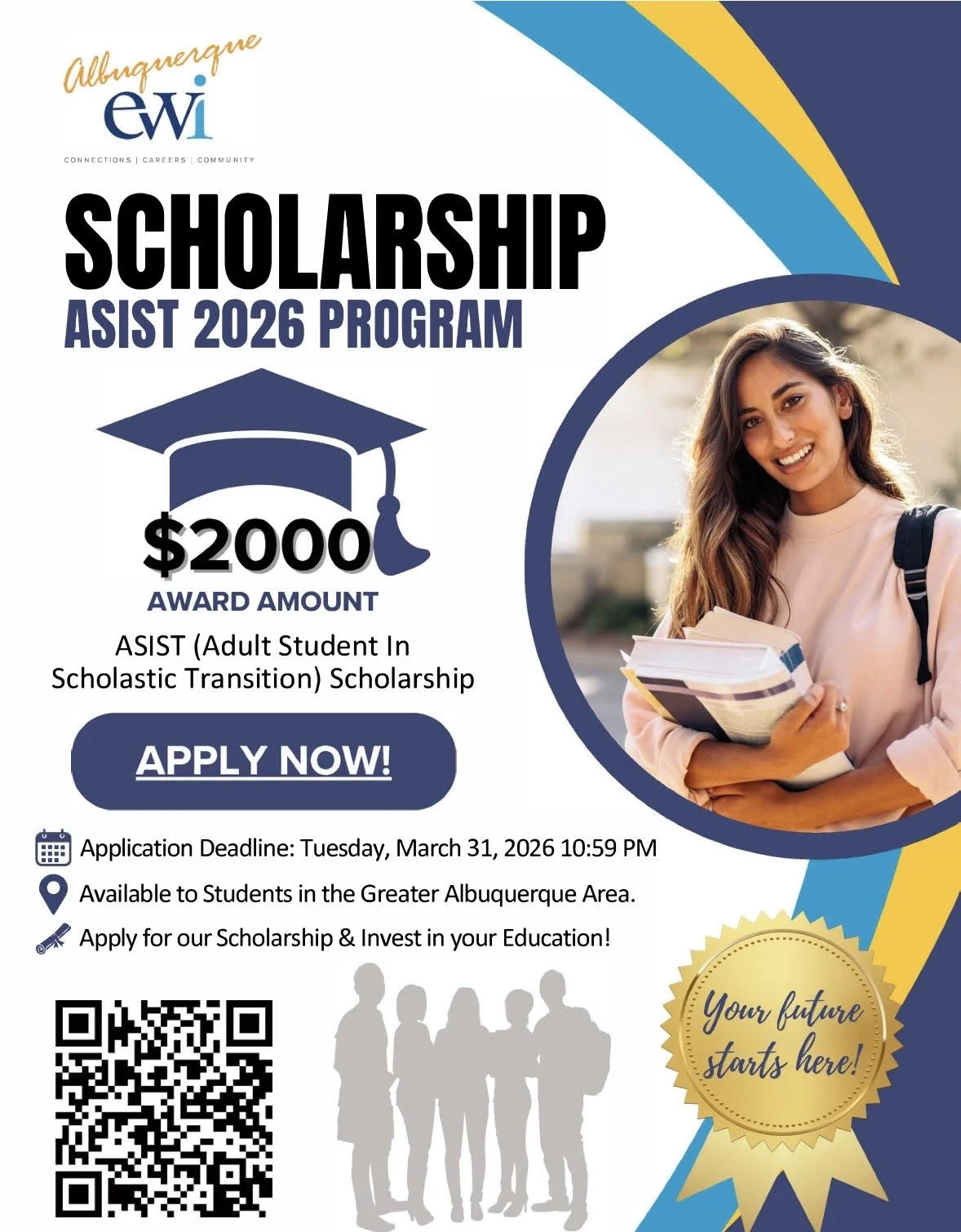 EWI Albuquerque offers 1 ASIST Scholarship annually for $2,000.00! The scholarship is open to students at Central New Mexico Community College (CNM), University of New Mexico (UNM) in Albuquerque and to any trade school student in the Bernalillo, Sandoval, Torrance and Valencia Counties.
